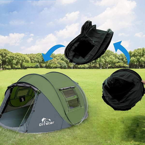 Vive la aventura al aire libre sin complicaciones con la carpa Orrstar desplegable instantánea, diseñada para ofrecer montaje rápido y máximo confort. Con postes premontados de fibra de vidrio, esta carpa se instala en segundos: solo abre el empaque, desata y déjala abrirse automáticamente, sin necesidad de buscar piezas o seguir instrucciones complejas. Fabricada en poliéster 190T resistente al agua (78,740 in), es duradera, anti-rasgaduras y ofrece una ventilación óptima para estancias prolongadas.