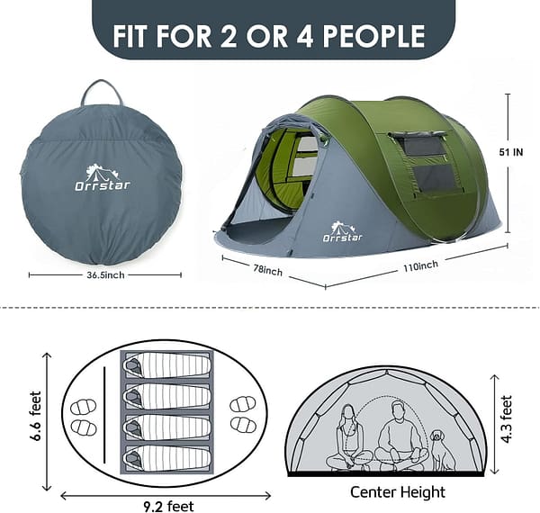 Vive la aventura al aire libre sin complicaciones con la carpa Orrstar desplegable instantánea, diseñada para ofrecer montaje rápido y máximo confort. Con postes premontados de fibra de vidrio, esta carpa se instala en segundos: solo abre el empaque, desata y déjala abrirse automáticamente, sin necesidad de buscar piezas o seguir instrucciones complejas. Fabricada en poliéster 190T resistente al agua (78,740 in), es duradera, anti-rasgaduras y ofrece una ventilación óptima para estancias prolongadas.