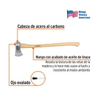 La cabeza de acero al carbono cuenta con un doble tratamiento térmico, que prolonga la vida útil del filo y asegura cortes más efectivos incluso en maderas duras. Su mango de hickory de 34” (85 cm) con acabado en aceite de linaza resalta la textura natural de la madera, ofrece un tacto más suave y garantiza mayor resistencia frente al desgaste ambiental.