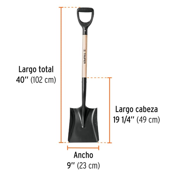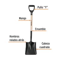 El mango de madera de 40 pulgadas, combinado con el innovador puño “Y” plástico de diseño offset, ofrece un agarre firme y cómodo, reduciendo la fatiga del usuario durante su uso prolongado. El ensamble por interferencia y remache asegura una unión sólida y permanente entre la cabeza y el mango, eliminando riesgos de desprendimiento. Los hombros rolados hacia atrás facilitan una penetración más eficiente en el material, aumentando la productividad en cada movimiento.