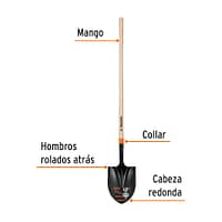 Su cabeza de acero al carbono de 1.5 mm de espesor ofrece gran durabilidad y penetración eficiente en distintos tipos de suelo. El mango largo de madera con acabado enlacado proporciona un agarre cómodo y firme, mientras que el collar reforzado asegura un ensamble robusto entre la cabeza y el mango, aumentando la resistencia al esfuerzo. Además, los hombros rolados hacia atrás mejoran la ergonomía y reducen la fatiga durante largas jornadas de trabajo.
